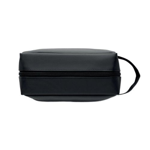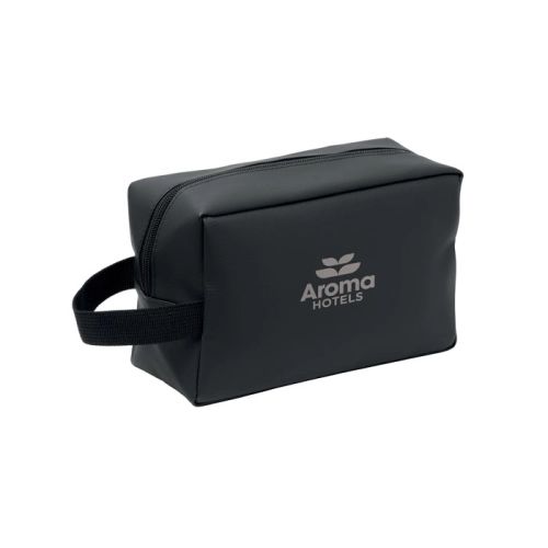 Toiletry bag made of 600D RPET polyester with PU coating and 210D RPET lining. Features zippered front pocket and handle.